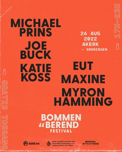 Bommen Berend Festival komt dit jaar op 26 augustus naar de Akerk. De indrukwekkende line-up bestaat uit EUT, Joe Buck, Michael Prins, MAXINE en Katie Koss. Myron Hamming, stadsdichter van Groningen, opent het festival op geheel eigen wijze. Het programma duurt van 17.00 tot 23.00 en de toegang is gratis.